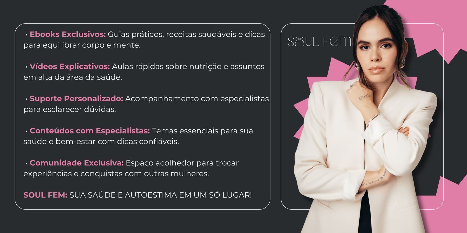 SOUL FEM é para mulheres que entendem a importância de cuidar do corpo e da mente como um todo, ou que estão no início dessa descoberta e desejam orientação para construir uma vida mais saudável, equilibrada e feliz.